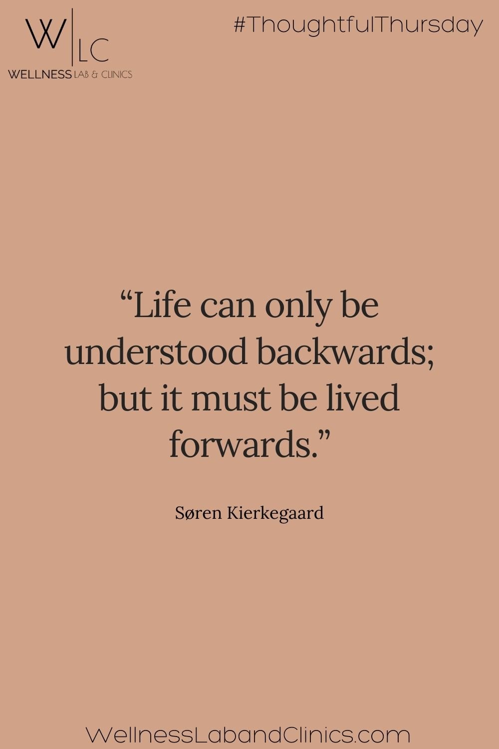 Image: On an orange background is this quote from Søren Kierkegaard: “Life can only be understood backwards; but it must be lived forwards.” WellnessLabAndClinics.com