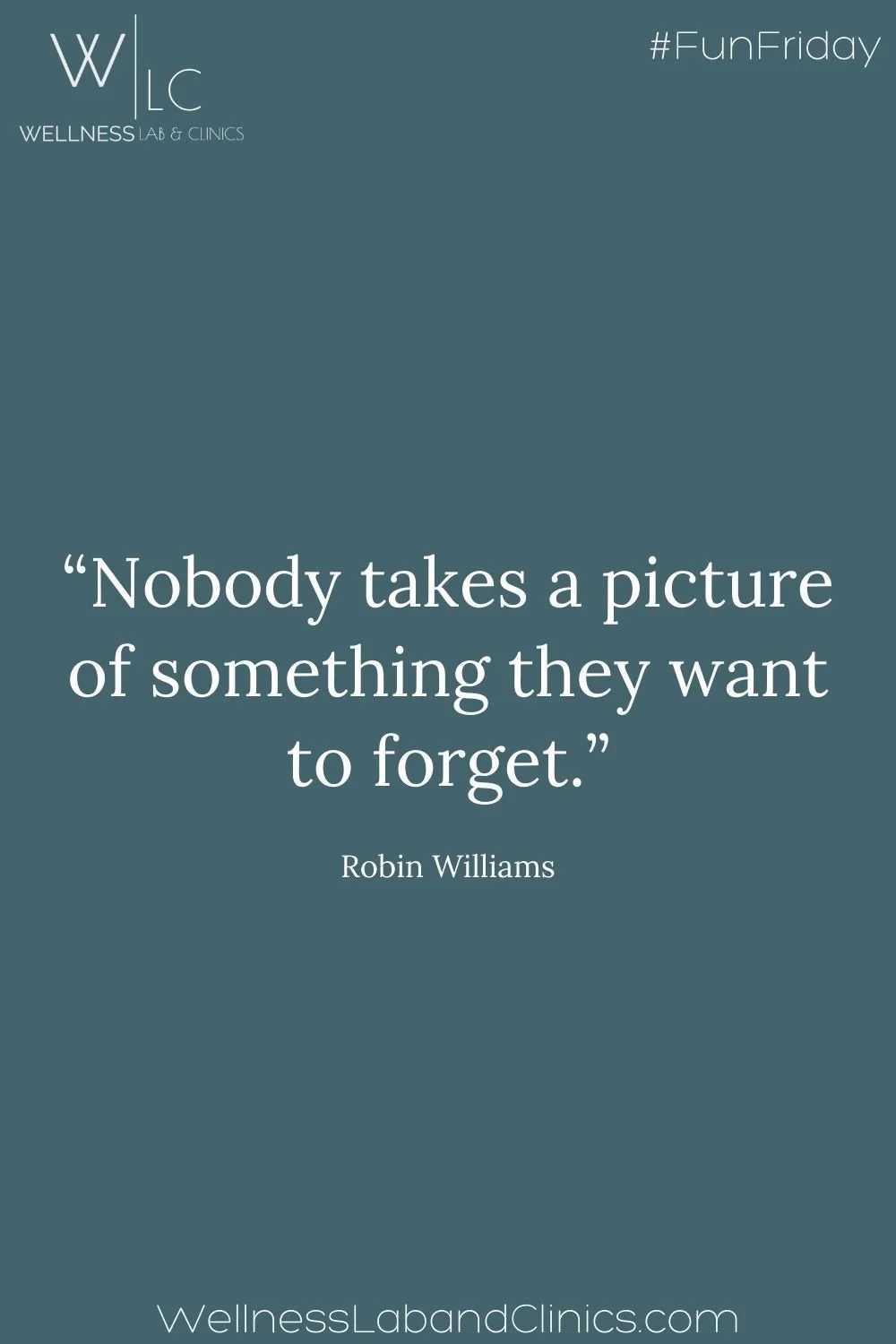 Image: Deep blue background with a quote from Robin Williams: “Nobody takes a picture of something they want to forget.” WellnessLabAndClinics.com