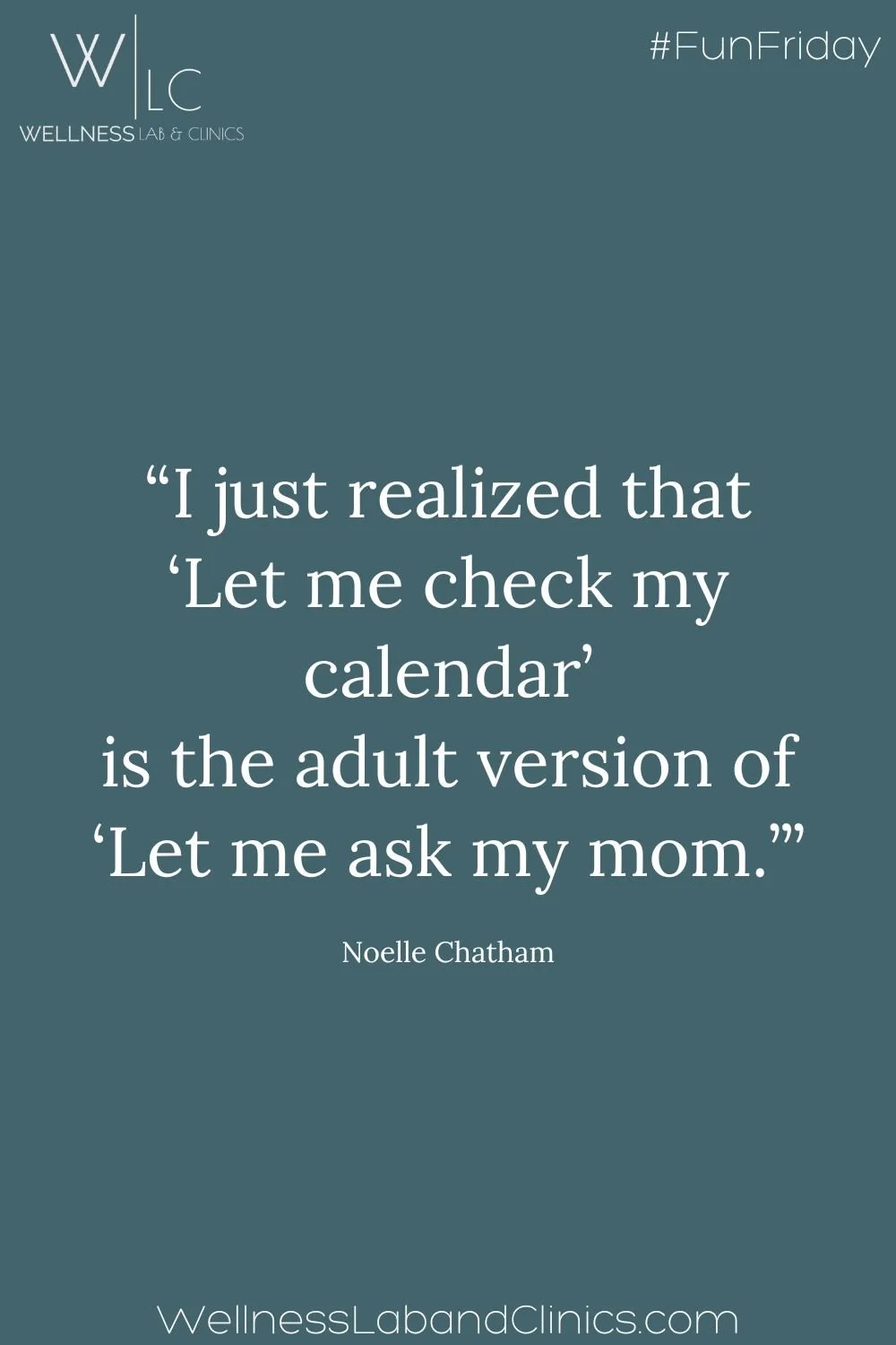 Image: On a deep blue background is this quote from Noelle Chatham: “I just realized that ‘Let me check my calendar’ is the adult version of ‘Let me ask my mom.’” WellnessLabAndClinics.com