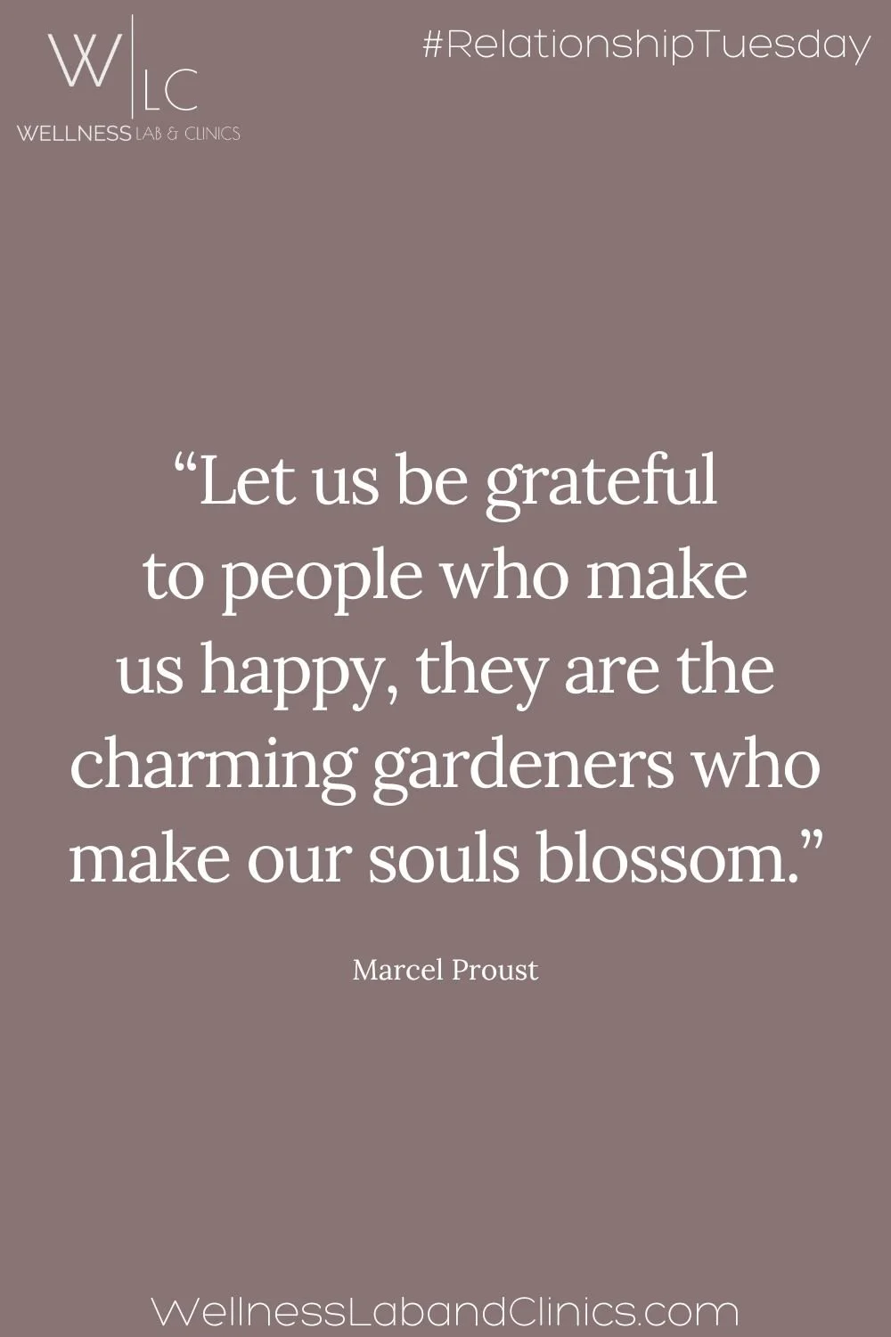 Image: On a deep plum background is this quote from Marcel Proust: “Let us be grateful to people who make us happy, they are the charming gardeners who make our souls blossom.” WellnessLabAndClinics.com