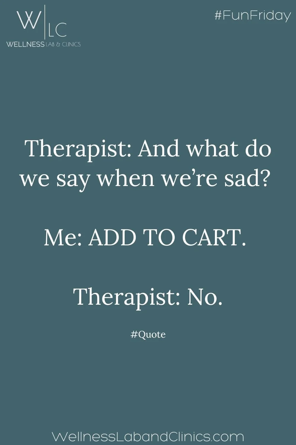 Deep blue background with this funny therapy exchange banter: "Therapist: And what do we say when we’re sad?