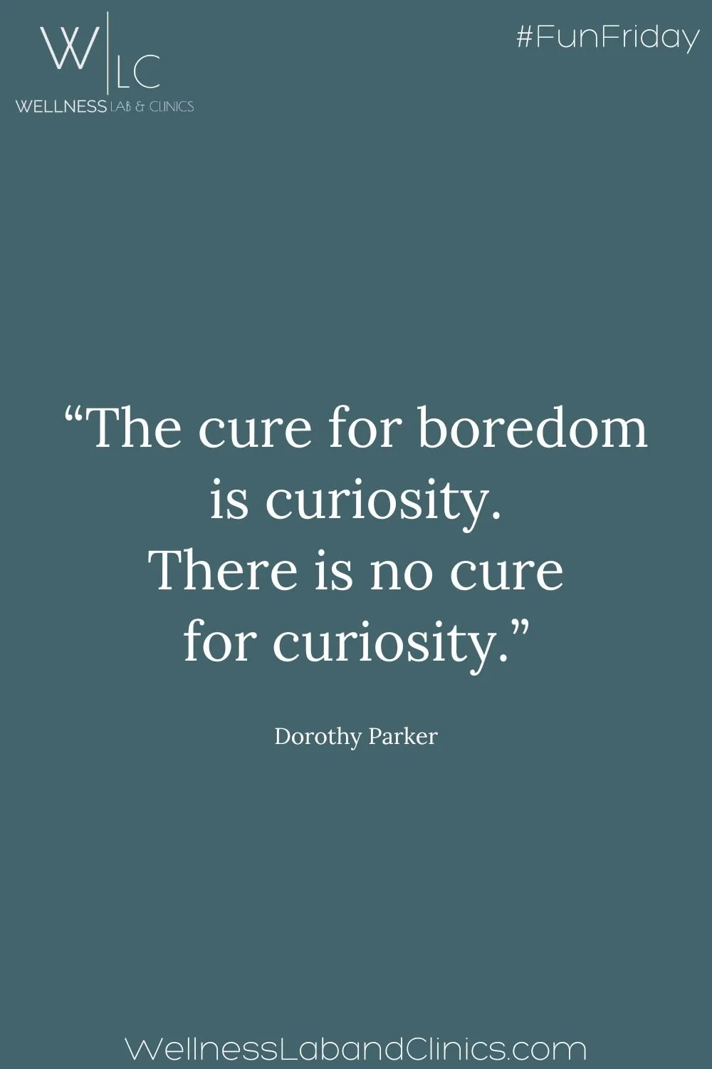 Image: Deep blue background with this quote from Dorothy Parker: The cure for boredom is curiosity. There is no cure for curiosity. WellnessLabAndClinics.com