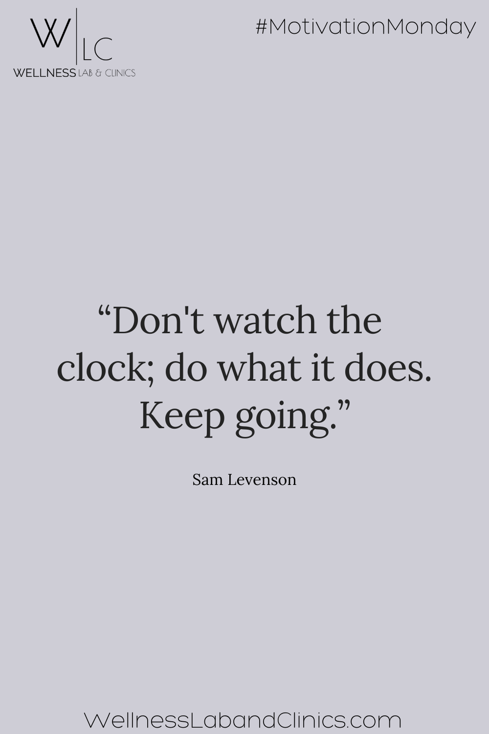 Image: Purple background with this quote from Sam Levenson: "Don't watch the clock; do what it does. Keep going." WellnessLabAndClinics.com