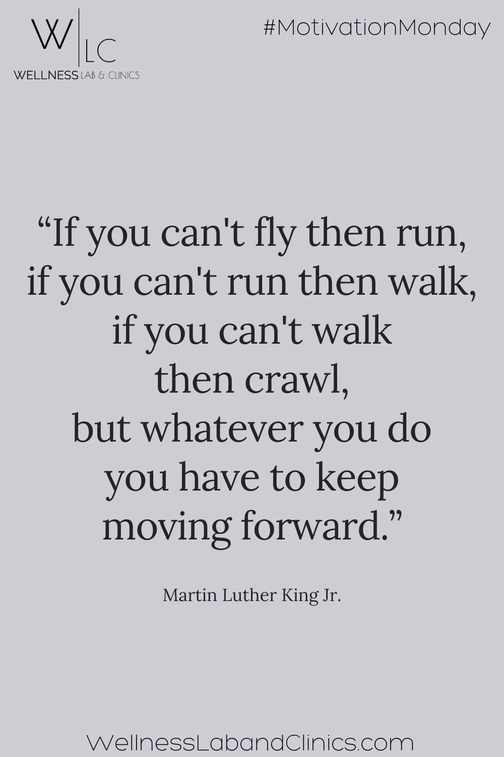 Image: On a light purple background is this quote by MLK, Jr., "“If you can't fly then run, if you can't run then walk, if you can't walk then crawl, but whatever you do you have to keep moving forward.” WellnessLabAndClinics.com