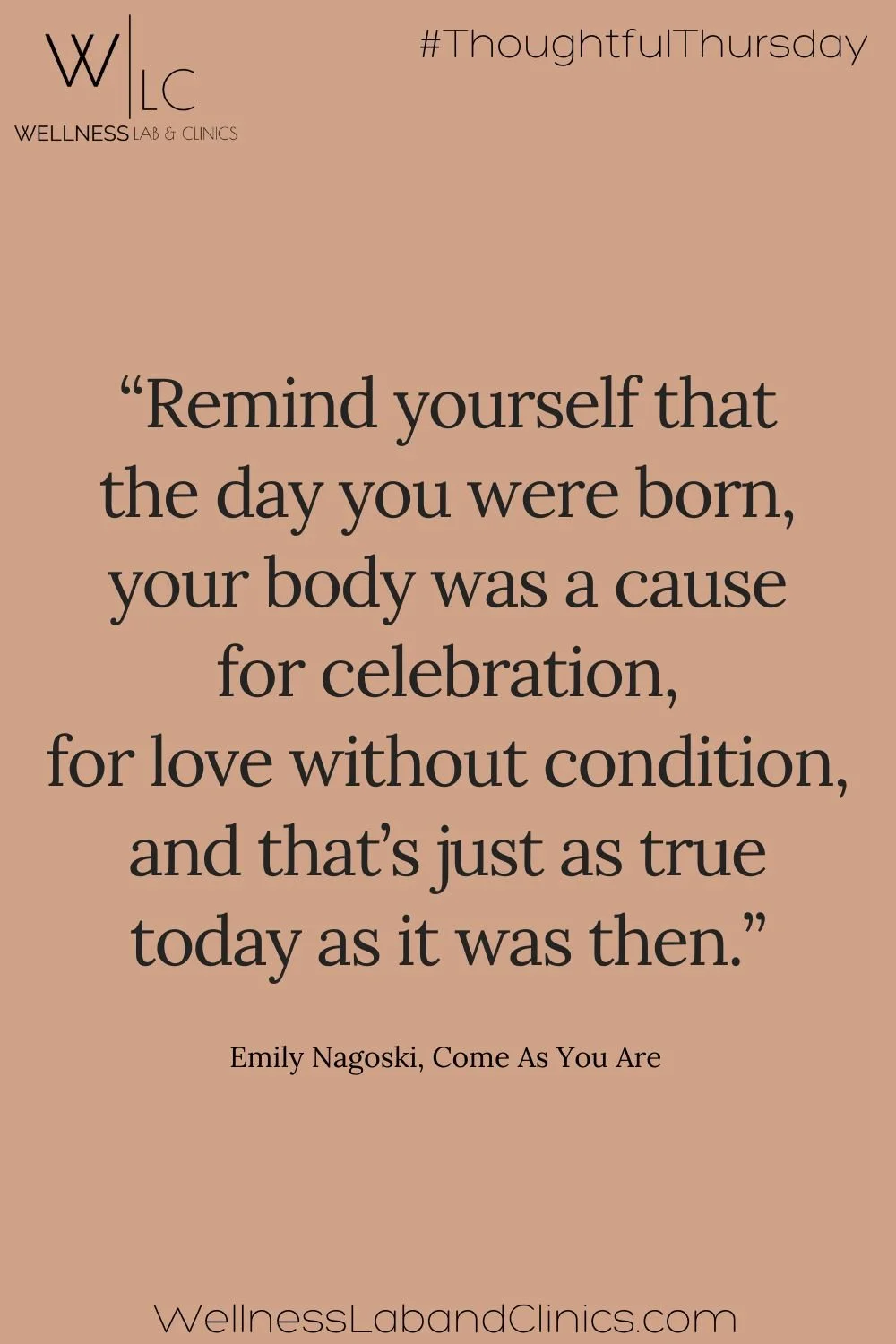 Orange background with this quote from Emily Nagoski, Come As You Are: “Remind yourself that the day you were born, your body was a cause for celebration, for love without condition, and that’s just as true today as it was then.” WellnessLabAndClinics.com