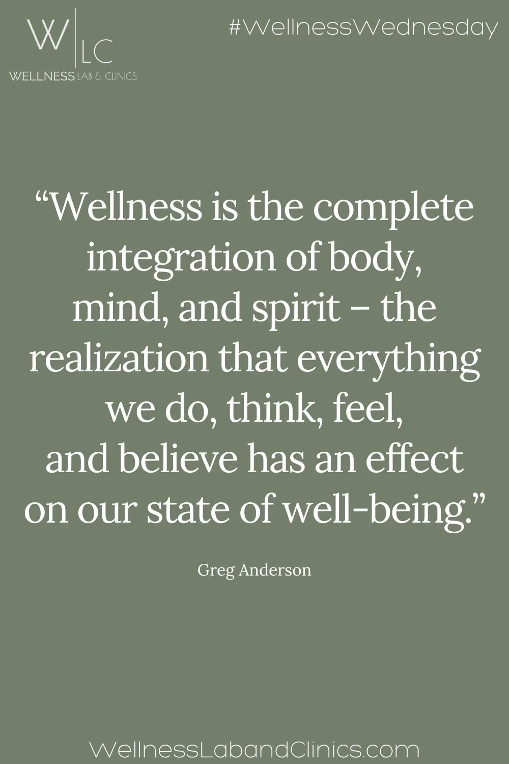 Image: Deep green background with this quote from Greg Anderson: “Wellness is the complete integration of body, mind, and spirit – the realization that everything we do, think, feel, and believe has an effect on our state of well-being.” WellnessLabAndClinics.com